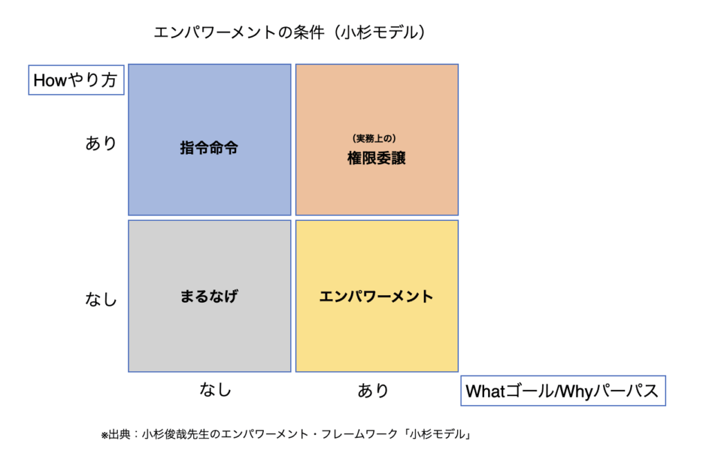小杉俊哉先生の「エンパワーメント・モデル」によれば、人をエンパワーするには What(何を達成するか)とWhy(なぜ重要か) を明確にし、How(どうやるか) は本人に任せることが不可欠です。